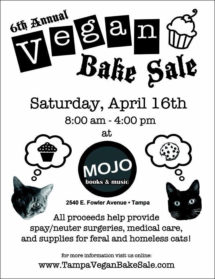 ALSO: I spoke briefly with Amber Simpson, organizer of the 6th Annual Tampa Vegan Bake Sale, taking place April 16 at Mojo Books and Records—the proceeds of while will help care for homeless and feral cats, and more. (www.facebook.com/AnimalAdvocacyTB/, http://tampaveganbakesale.blogspot.com)